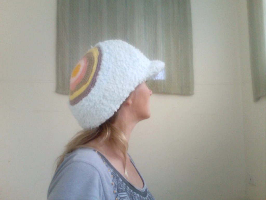 Former hard hat covered with hand-knitting.