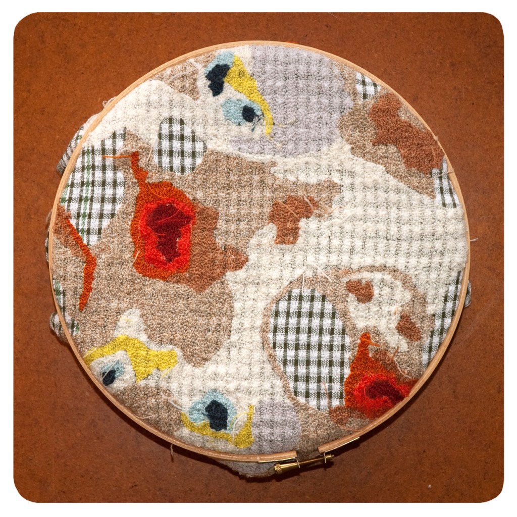 It Is A Pancake Universe | textile art | technique: tuft embroidery | merino wool thread on cotton up cycled tea towel | size: 27 x 27 x 2 cm | production date: December 2012