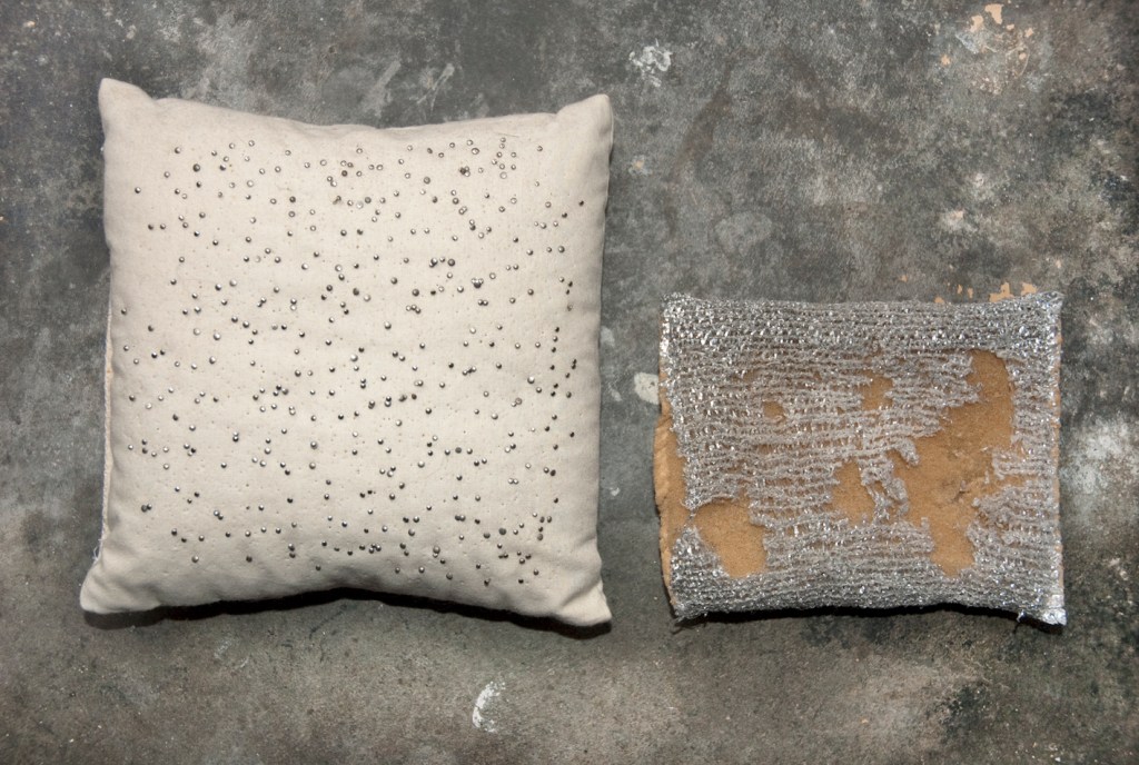 On the left: Stars In Daylight Sky | Cosmic Found Object | materials: cotton, metal pins & unidentified fibre filling | size: 15 x 15 x 5 cm | date found: 2009 | On the right: Scourer Nebula | Cosmic Found Object | used up scourer | size: 10 x 11 x 1 cm | date found: 2010 | both writings accompanying the objects are from April 2013