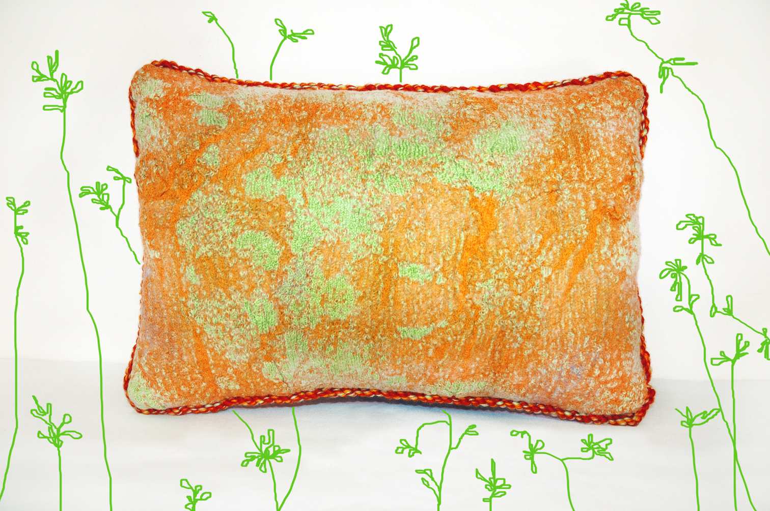 Carrot Cushion | handmade cushion – interior accessory | techniques: nuno-felting, machine knitting, rope making, embroidery & sewing | materials: merino wool, cotton, leftover yarn & corn fibre filling | size: 42 x 28 x 13 cm | production date: 2013