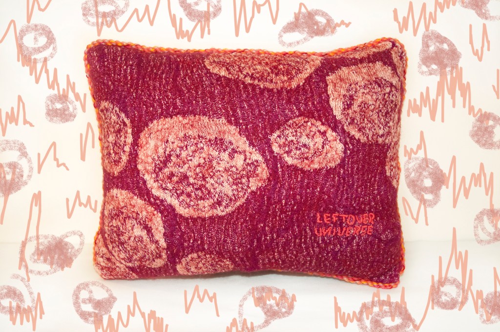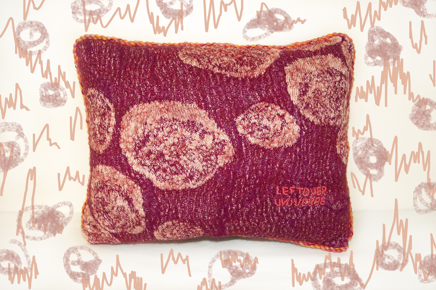 Life Is Like A Toffee Apple, bitter sweet | handmade cushion – interior accessory | techniques: nuno-felting, machine knitting, rope making, embroidery | materials: merino wool, cotton, leftover yarn & corn fibre filling | size: 38 x 30 x 15 cm | production: 2013