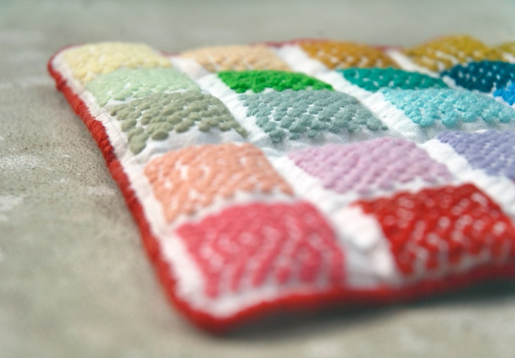 detail of Made You A Rainbow Formula | medium: Textile Art & Design – Interior Accessories | techniques: hand embroidery & hand quilting | materials: discarded leftover wool yarn on cotton fabric & organic corn fibre filling | size: 19 x 19 x 1,5 cm | production date: 2014
