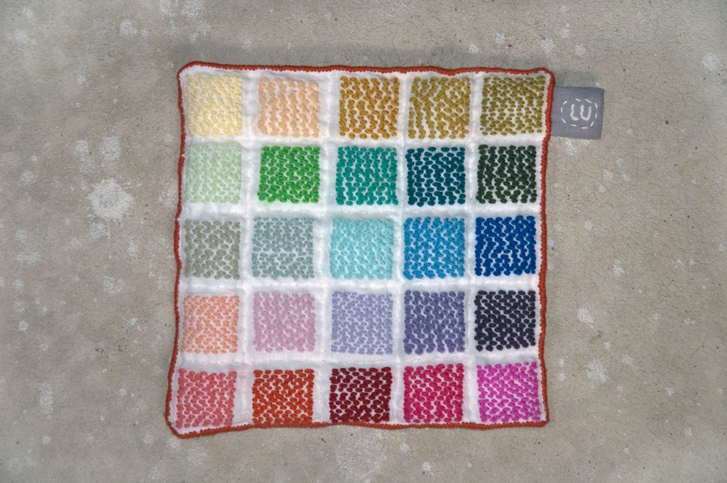Made You A Rainbow Formula | medium: Textile Art & Design – Interior Accessories | techniques: hand embroidery & hand quilting | materials: discarded leftover wool yarn on cotton fabric & organic corn fibre filling | size: 19 x 19 x 1,5 cm | production date: 2014