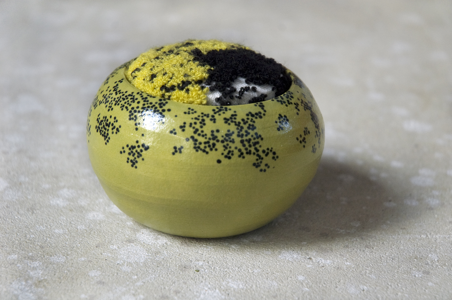 In The Blink Of An Eye | mixed media ceramics | techniques: pottery & textile art; tuft embroidery & button making | materials: glazed stoneware with woollen tuft embroidered lid | size: 8 cm x 11 cm x 11 cm | production date: August 2014