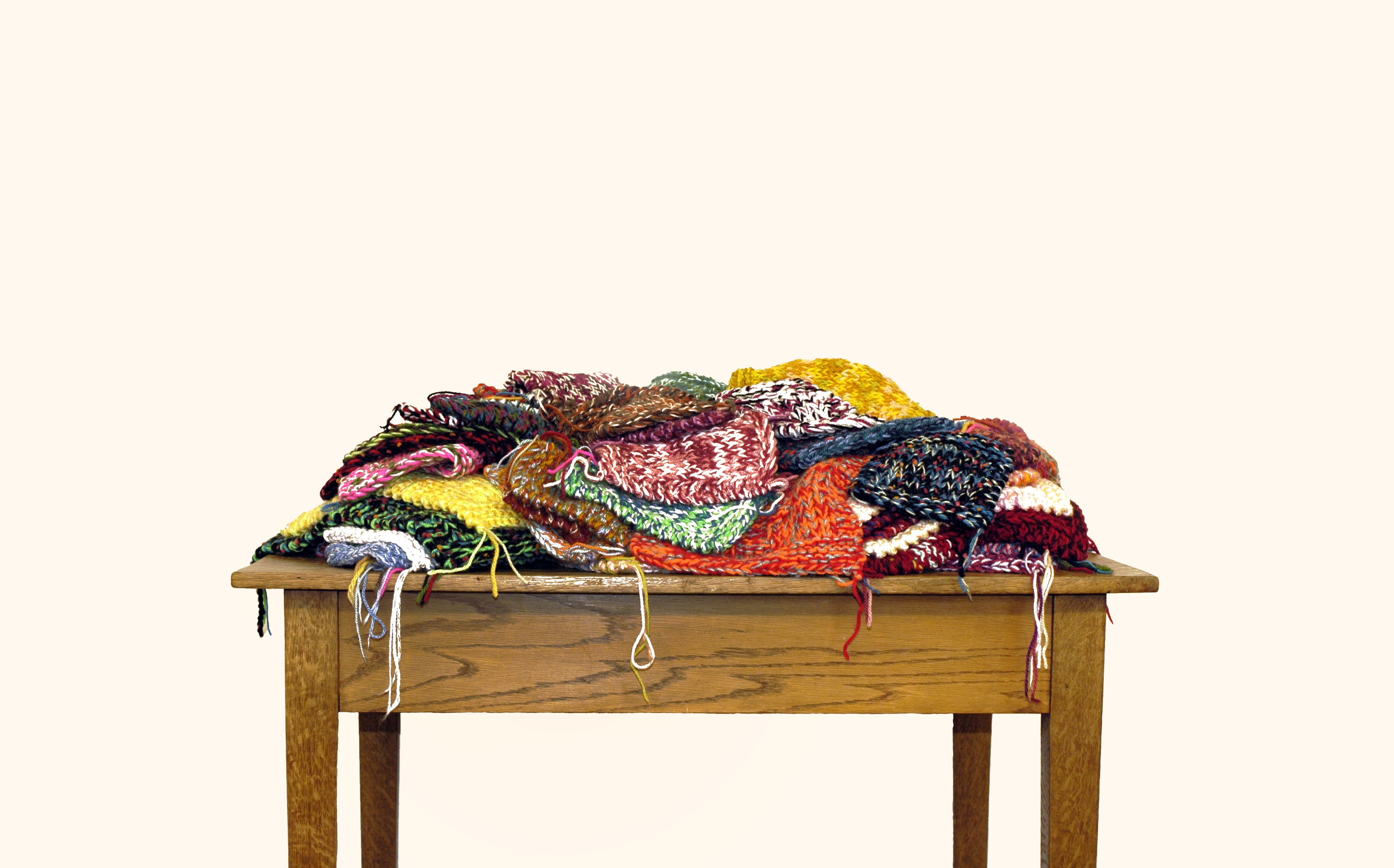 Schilderij ‘n Brei | medium: installation art – part of installation | techniques: knitting | materials: discarded leftover acrylic yarn & found table | production date: 2004 – 2005