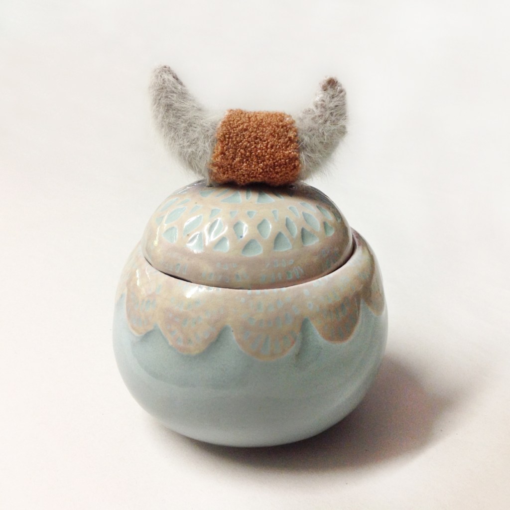 Croissant Animalis | mixed media ceramic jar | glazed white stoneware, up cycled fabric, merino wool & corn fibre filling | size: 17 x 11 x 11 cm | March 2015