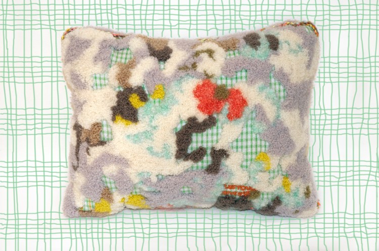 Right: It Is A Pancake Universe – Tuft embroidery on old tea towel made in 2013. Merino wool on cotton. Cushion cover.