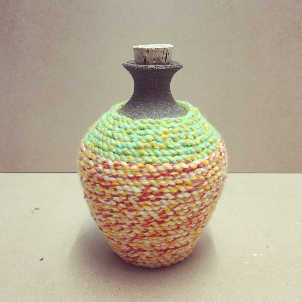 Stoneware ceramic jar covered with basketry weaving from hand twisted rope and cork lid | 21 x 13 x 13 cm | October 2015