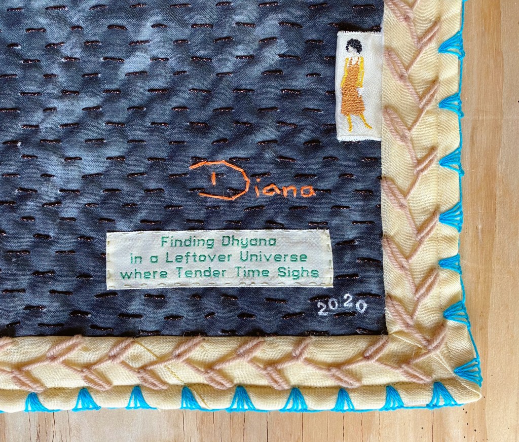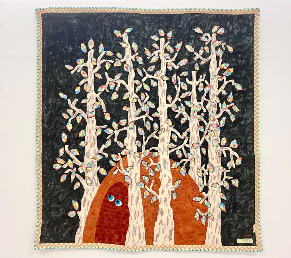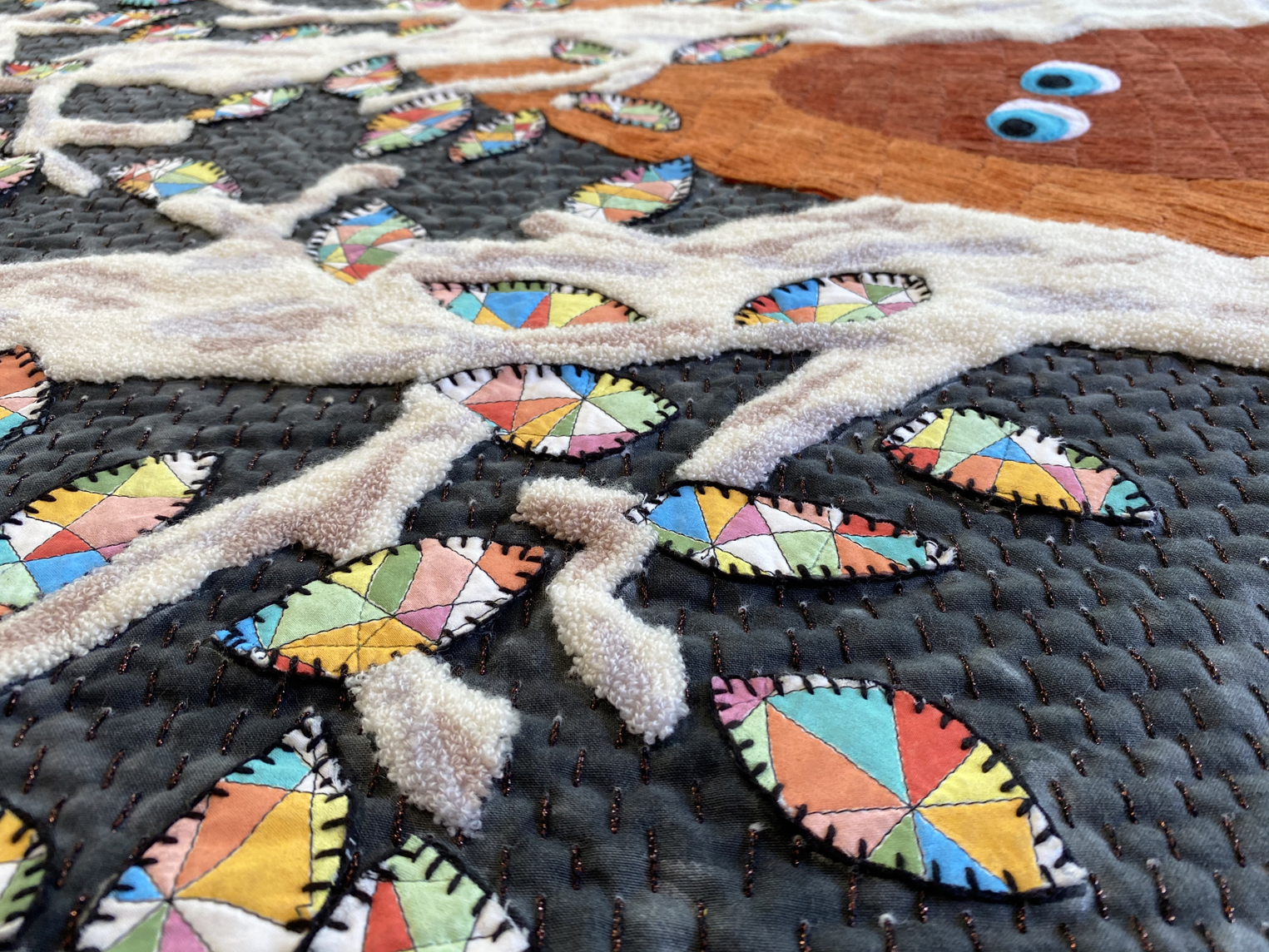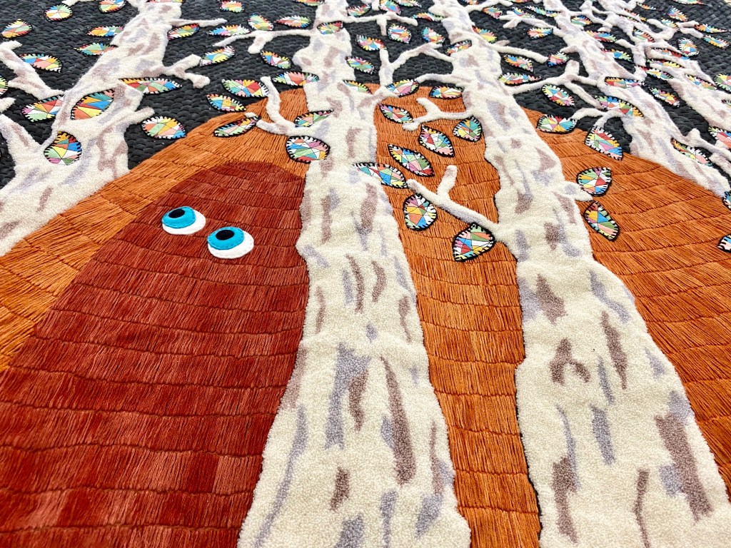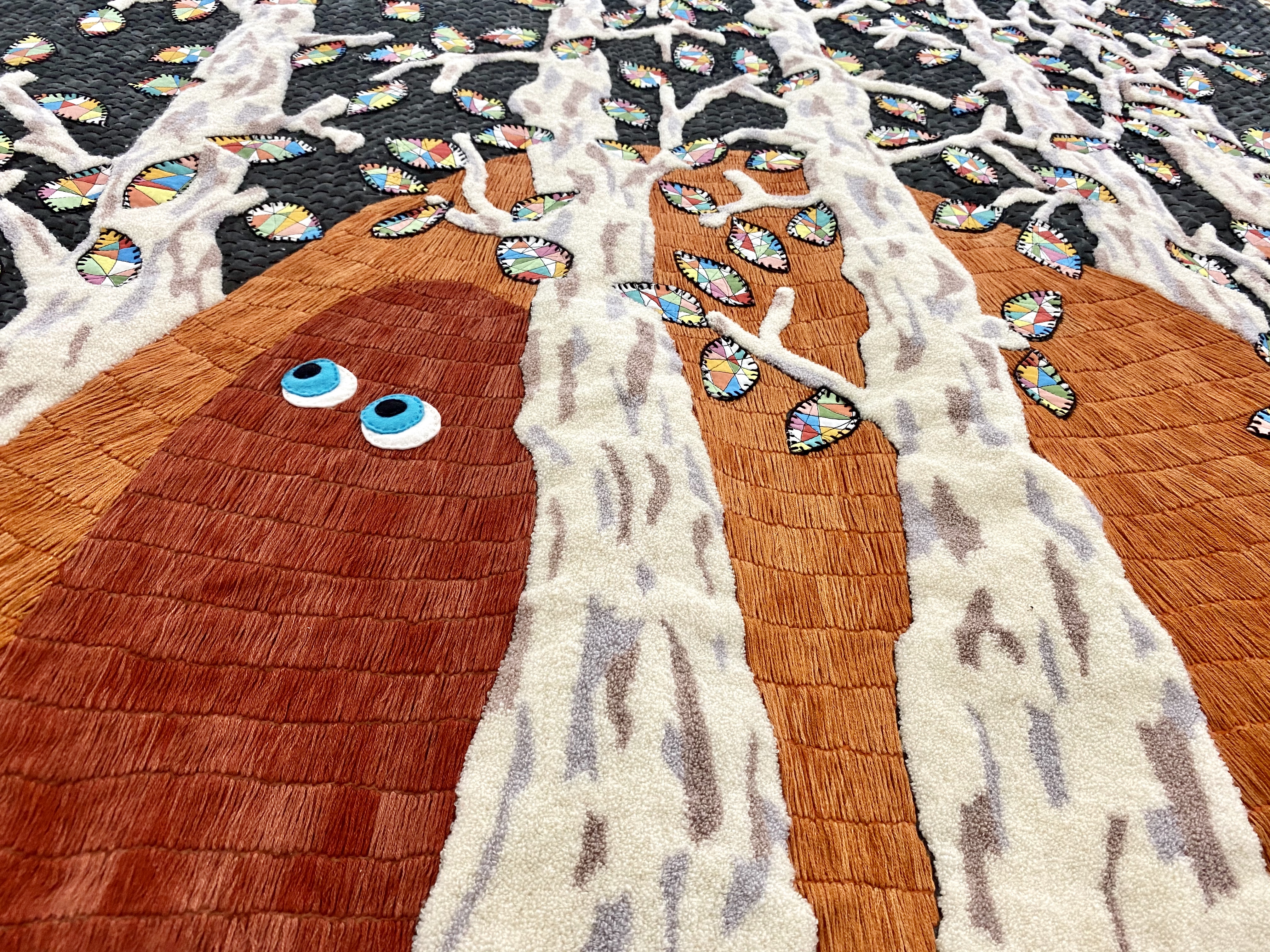 Home-In-The-Woods | Medium: Textile Art – Tapestry | Techniques: embroidery, hand-stitching, hand painting, tuft embroidery, Sashiko, appliqué | Materials: natural dyed bamboo yarn, wool yarn, cotton, merino wool felt, eco friendly textile ink | Size: 138 x 150 cm | Production date: July 2018 – November 2020