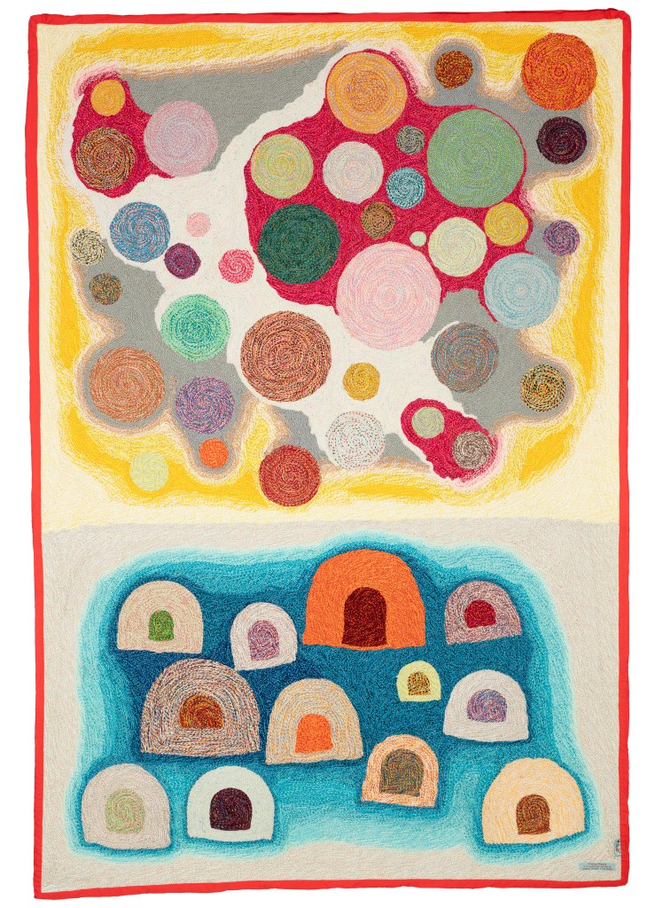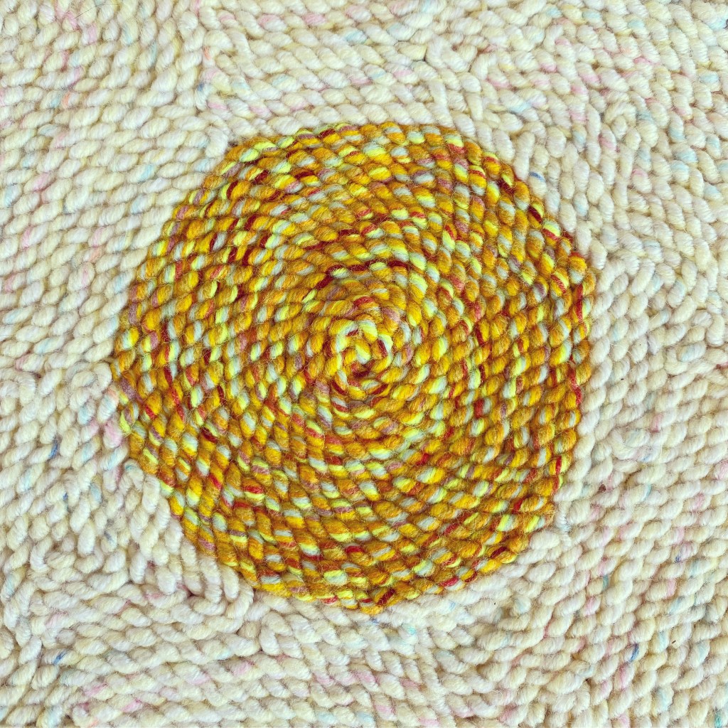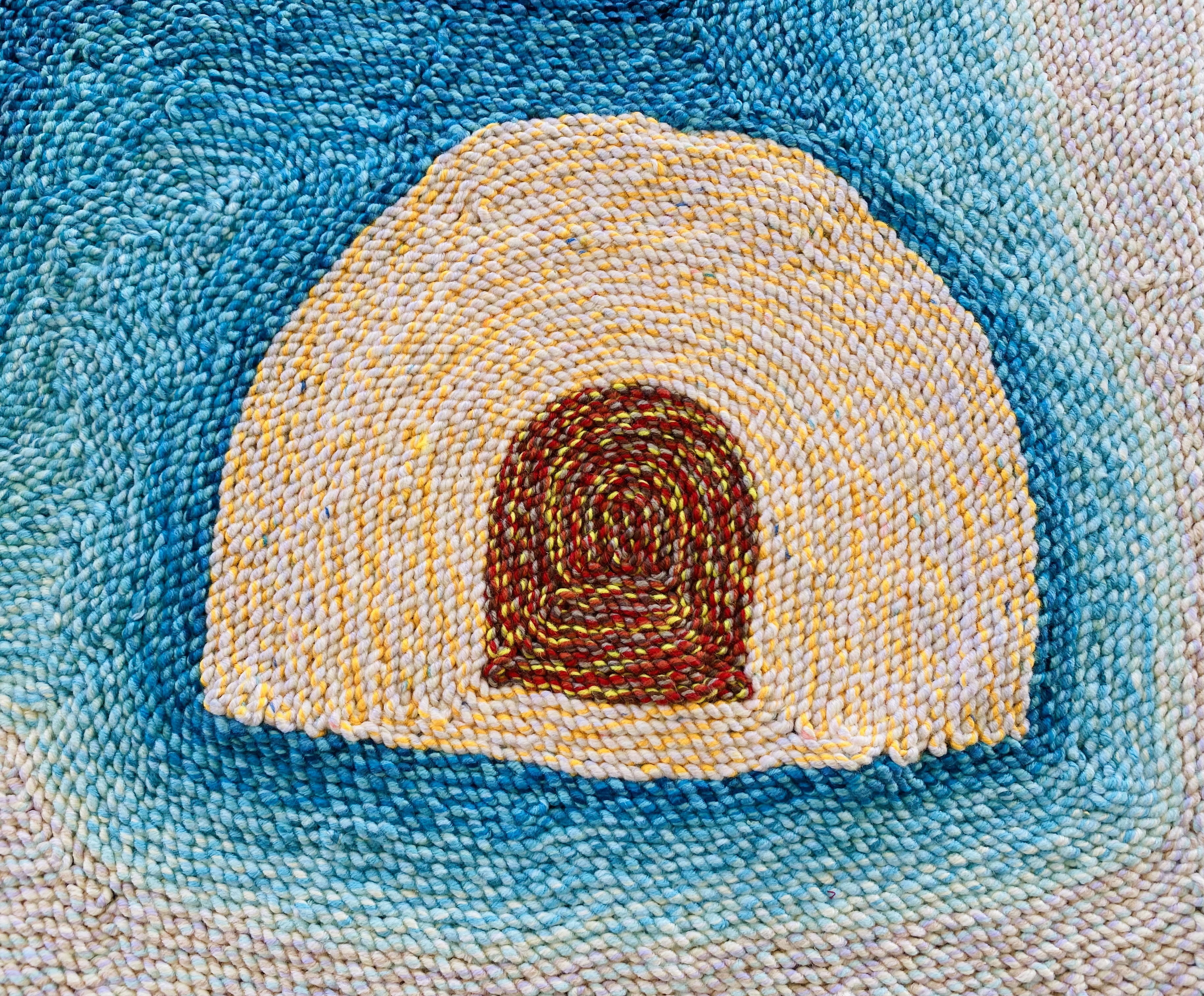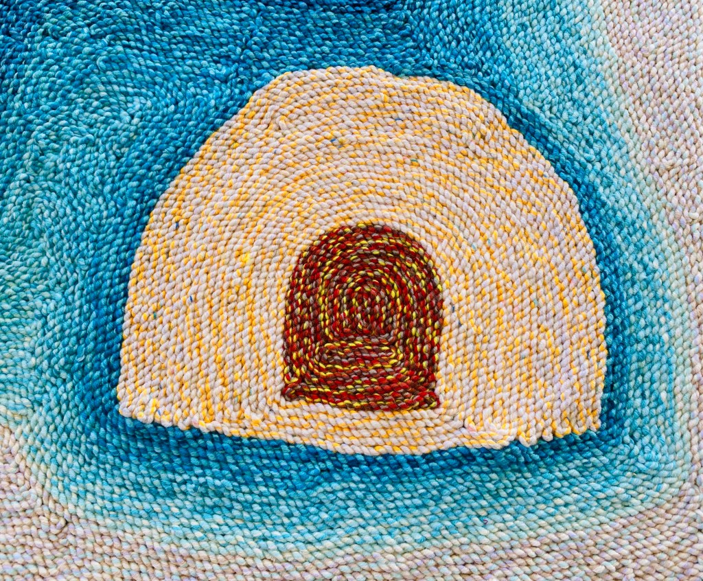 Whether lightning fast or barely moving, things are in constant motion in an ever evolving landscape of time. Roaming this landscape we go deeper and deeper through spiralling cycles and open doorways in mountains to be climbed. Many new suns are born into a world where the rhythm of the process, the rhythm of creation is made visible in a tapestry woven with time, in time and about time. Swirling puddles in the sky and gateways without doors speak of jumping dimensions and crossovers. A universe held together by colourful handmade reverse wrapped cordage, shaped like the DNA double helix, transports us to a place where the sun is shining, the sandy shore pure and bright and the ocean deep and blue.