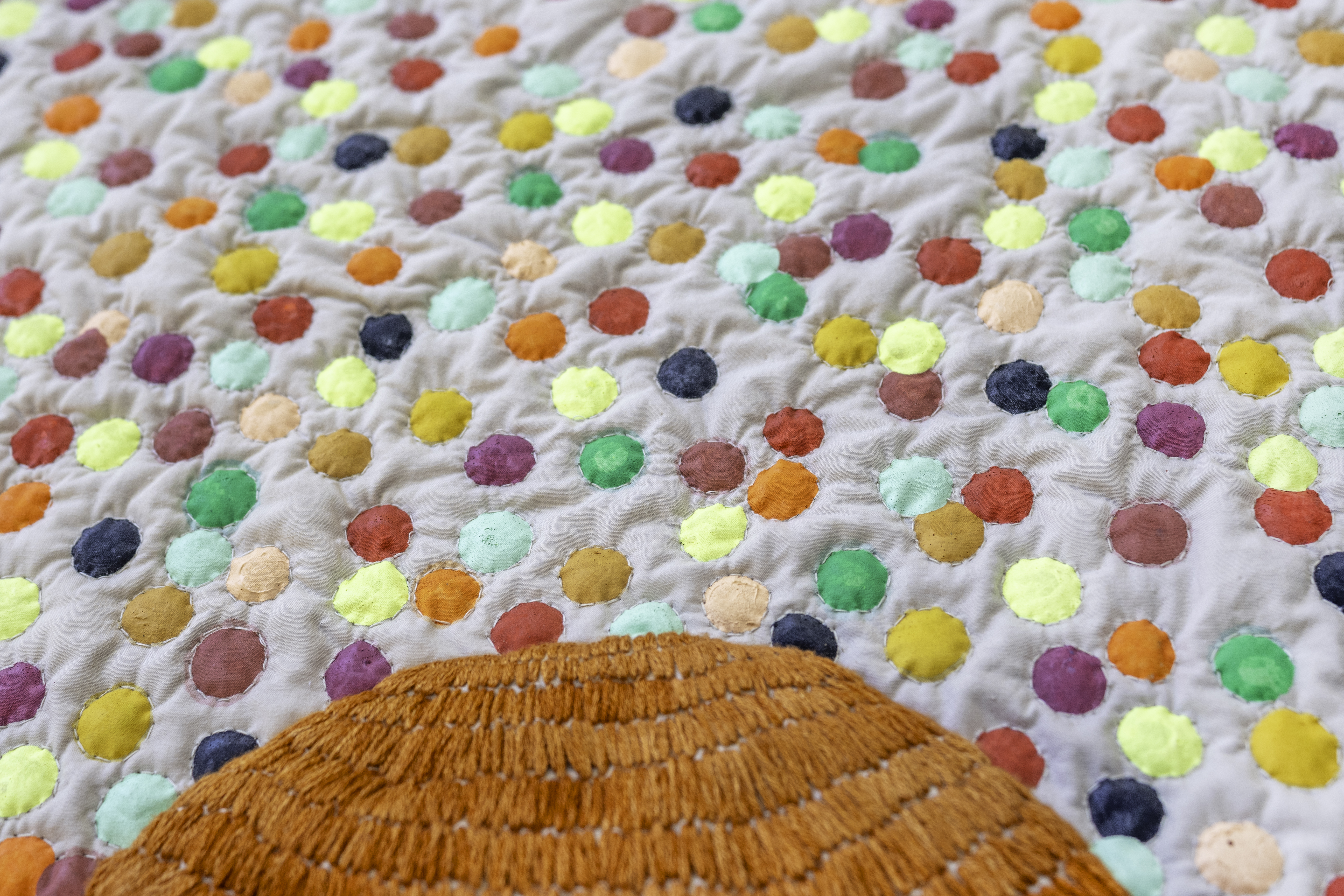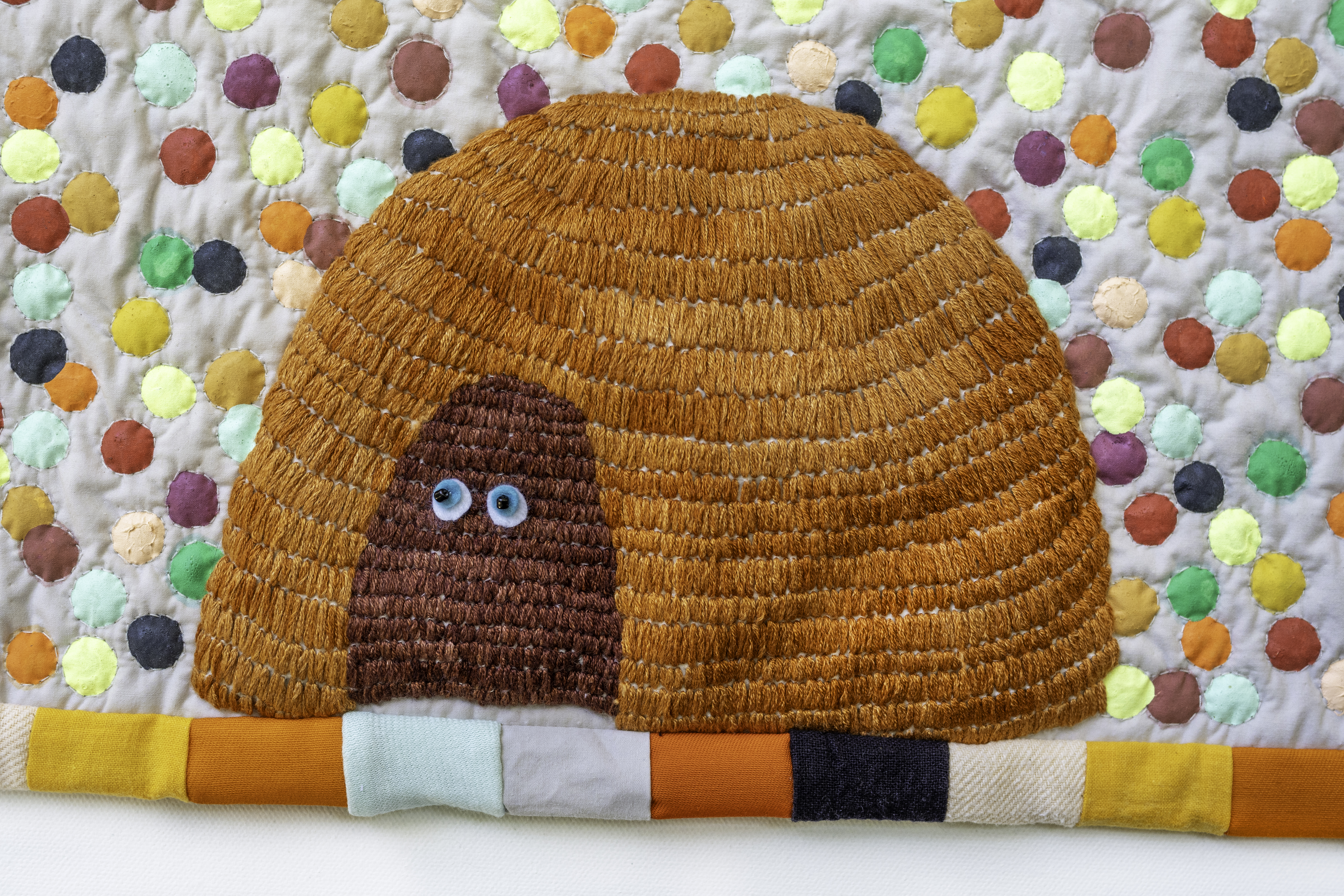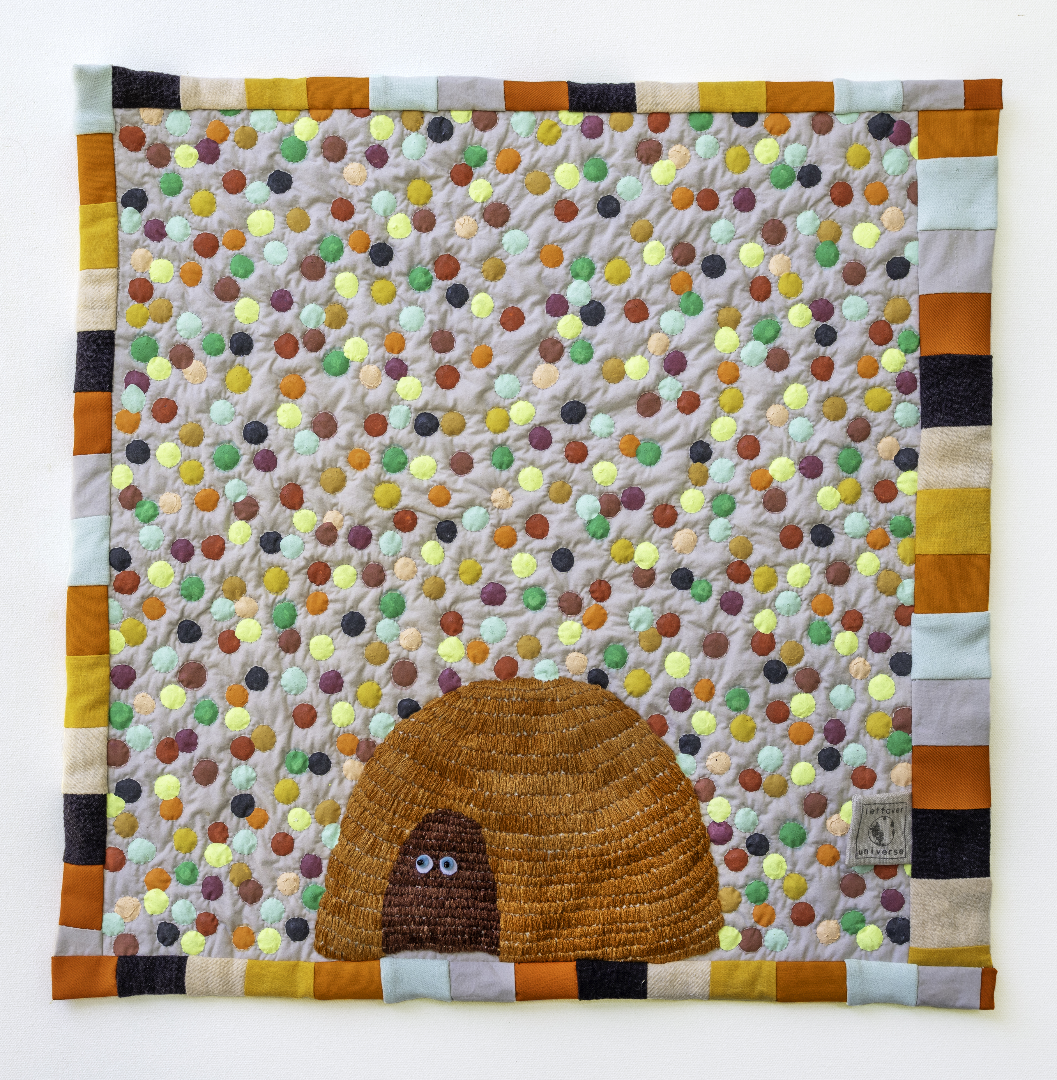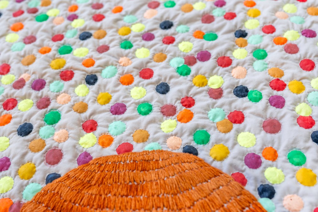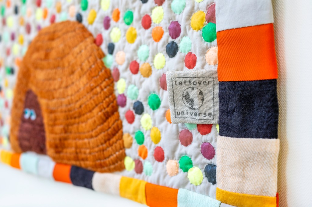 It’s All In The Air, Everything Is In The Air | tapestry | techniques: embroidery, hand painting on textile, quilting, appliqué, beading, patchwork | materials: discarded, leftover cotton & linen fabrics, merino wool felt, eco friendly textile ink, glass beads, natural dyed bamboo yarn, cotton thread & undyed cotton wadding | size: 51 x 51 x 2 cm | production date: January 2024
