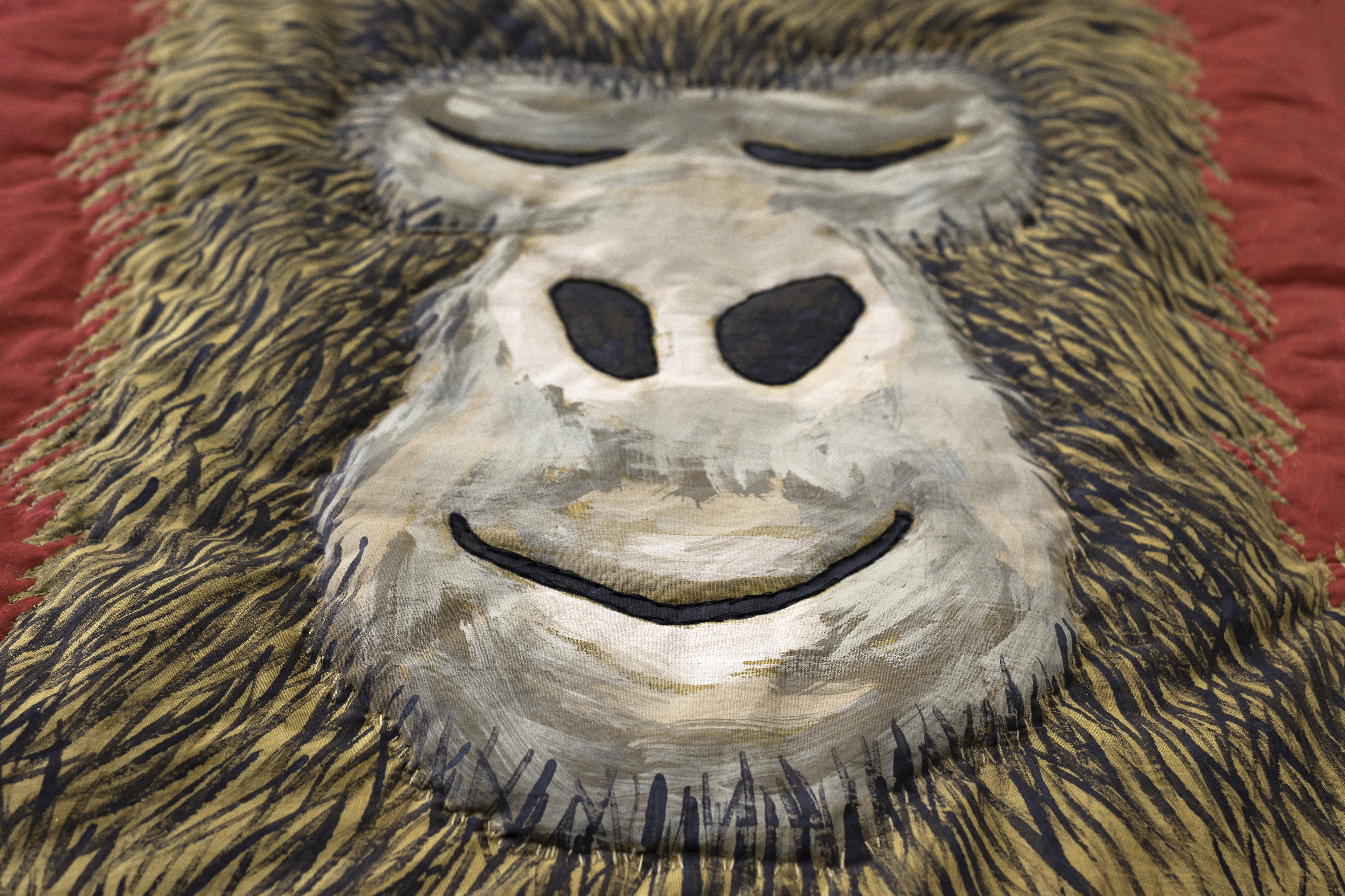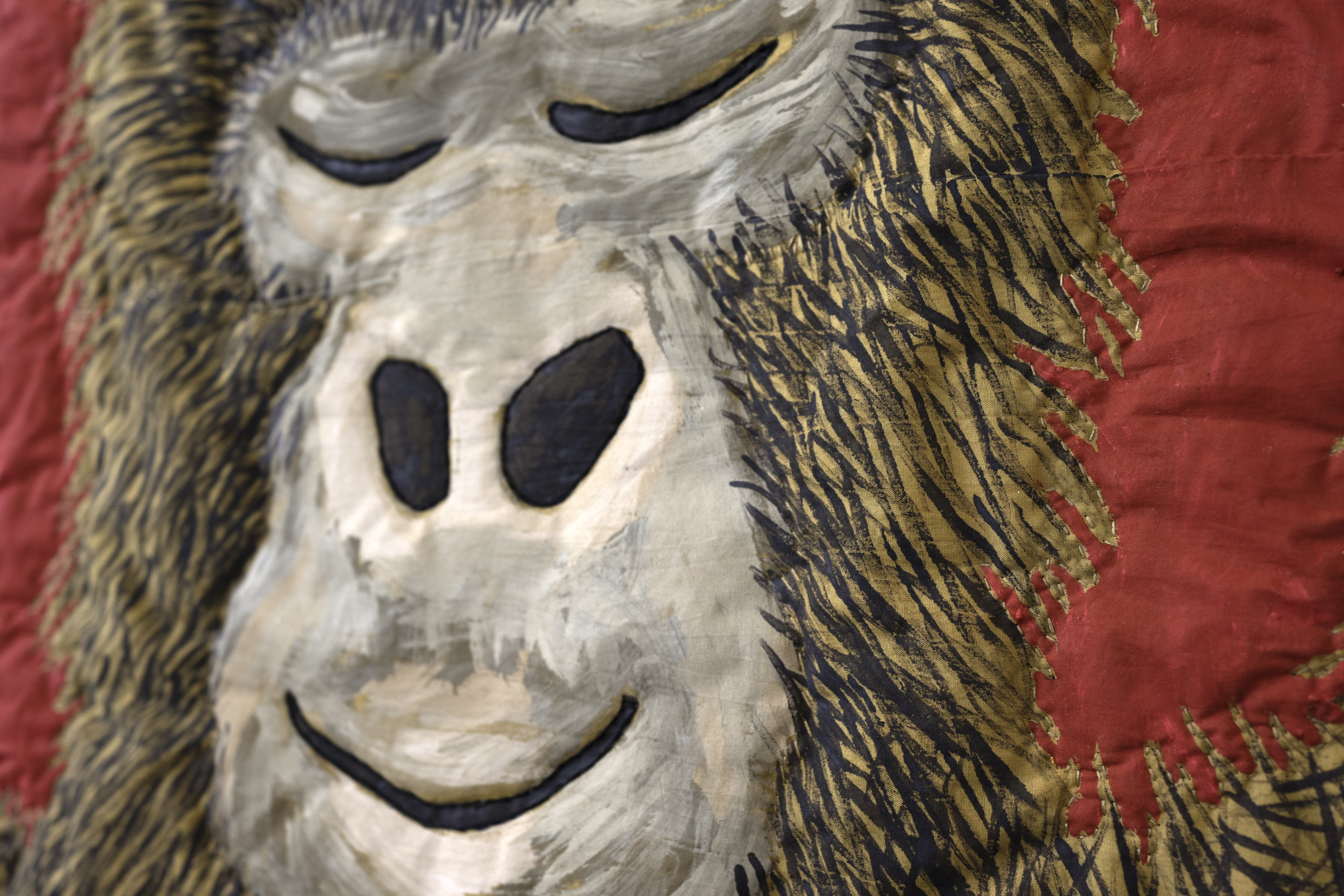 Cut It Out And Cut It Off | quilt – textile art | Materials: discarded, leftover cotton fabric, glittery nylon/polyester fabric, eco friendly textile ink, cotton thread & undyed cotton wadding | Techniques: hand quilting, hand stitching, hand painting on textile & embroidery | size: 50 x 50 x 2 cm | production date: May 2020 – January 2024