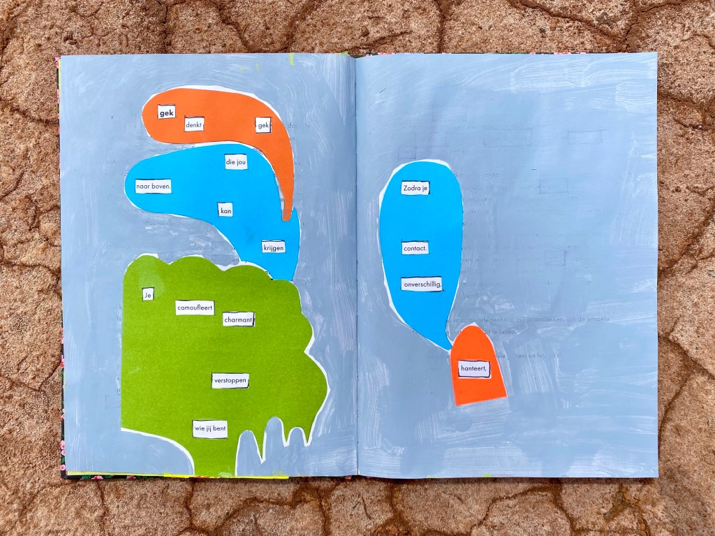 Camouflage | medium: found poetry art book & mixed media art | techniques: found poetry, painting & paper cut in paper book | dimensions: 22 x 32 cm | production date: 20 September 2025