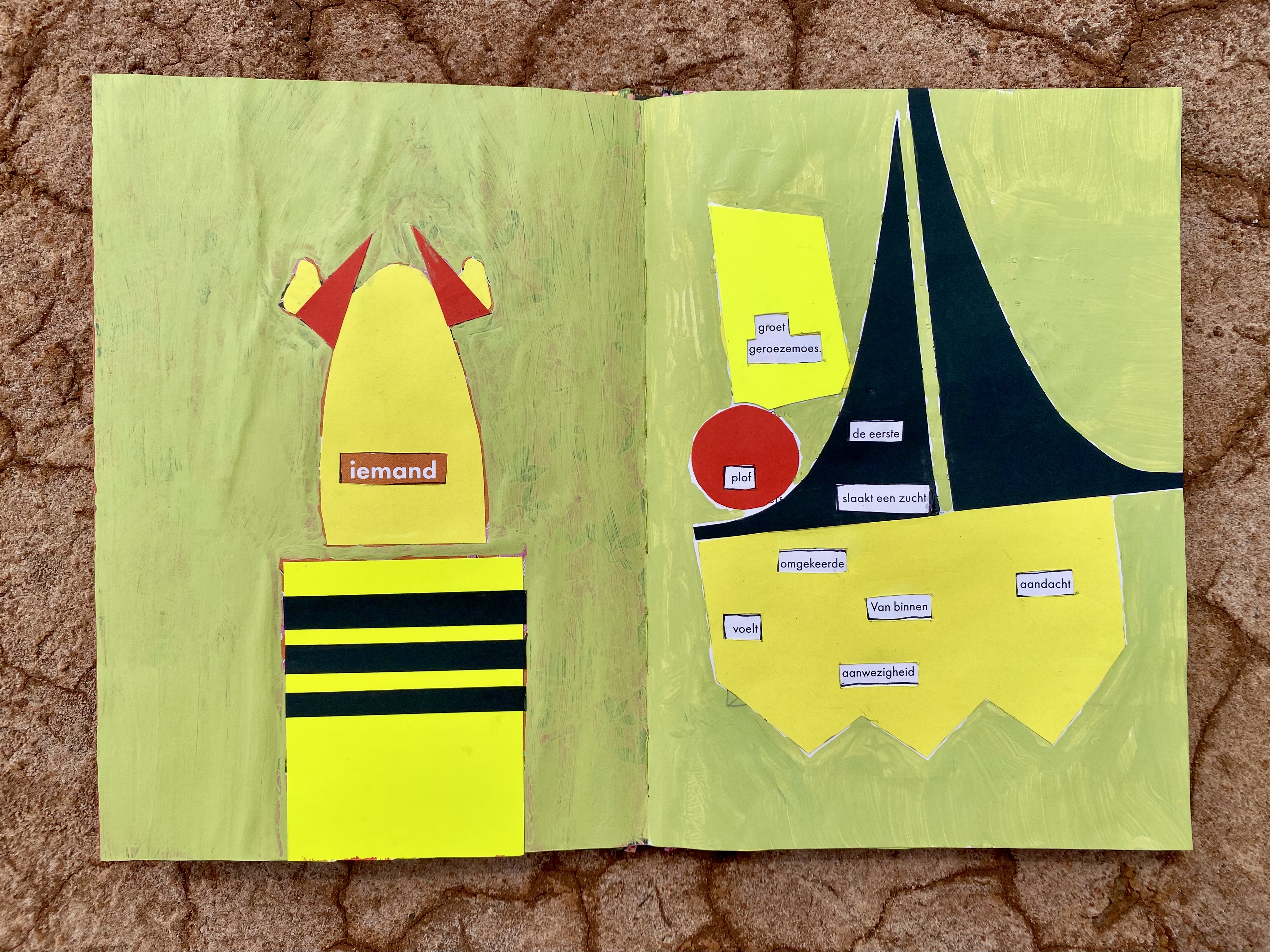 Groet Geroezemoes | medium: found poetry art book & mixed media art | techniques: found poetry, painting & paper cut in paper book | dimensions: 22 x 32 cm | production date: 21 September 2025