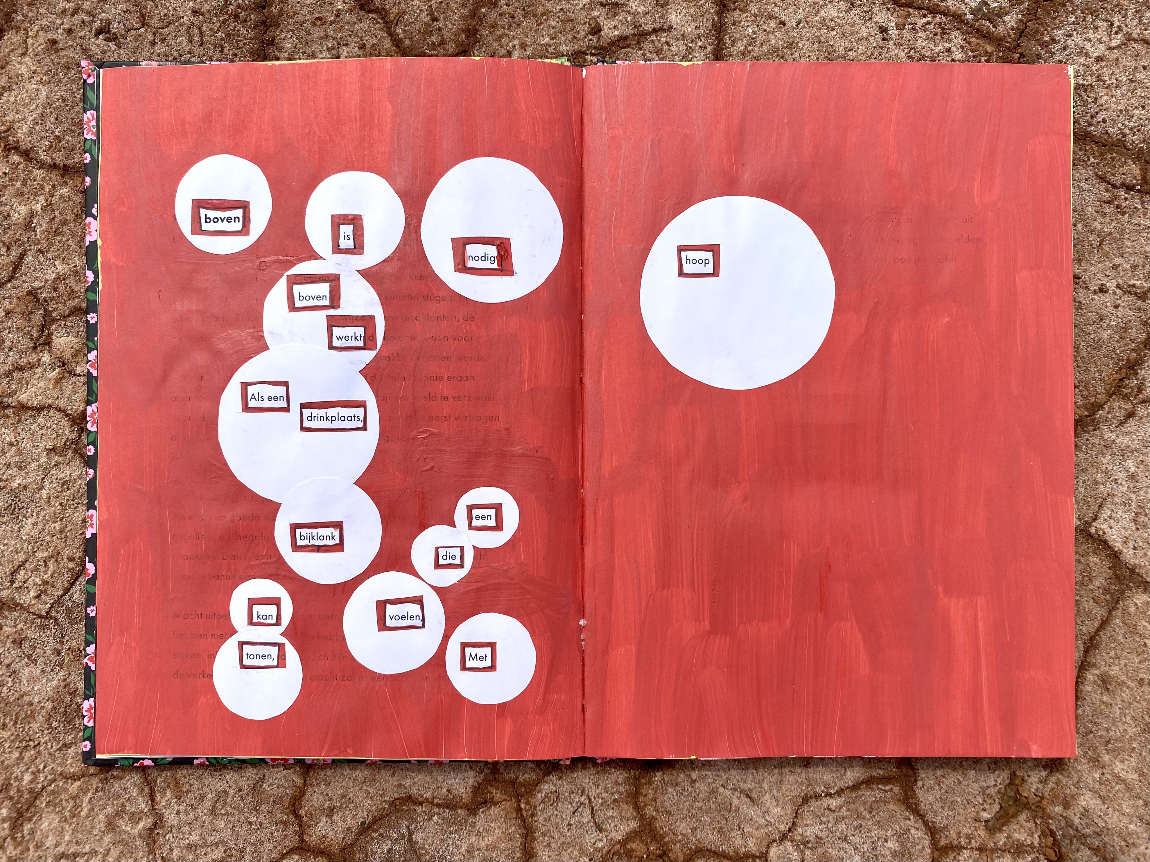 Drinkplaats | medium: found poetry art book & mixed media art | techniques: found poetry, painting & paper cut in paper book | dimensions: 22 x 32 cm | production date: 22 September 2025