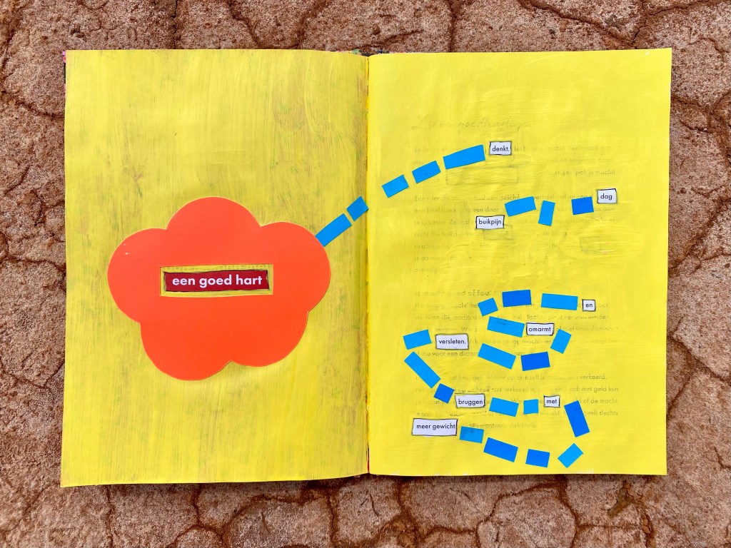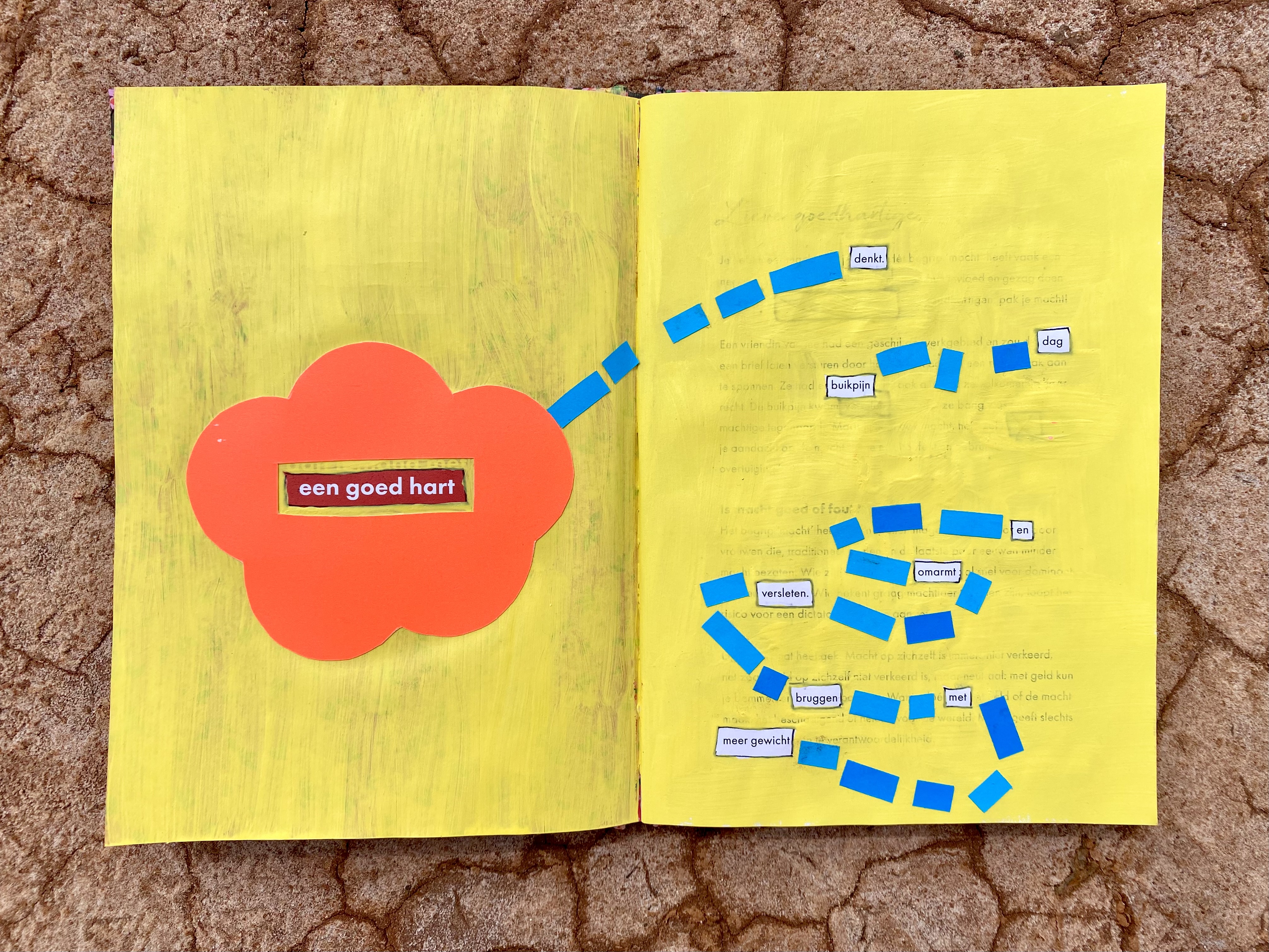 Versleten Bruggen| medium: found poetry art book & mixed media art | techniques: found poetry, painting & paper cut in paper book | dimensions: 22 x 32 cm | production date: 22 September 2025