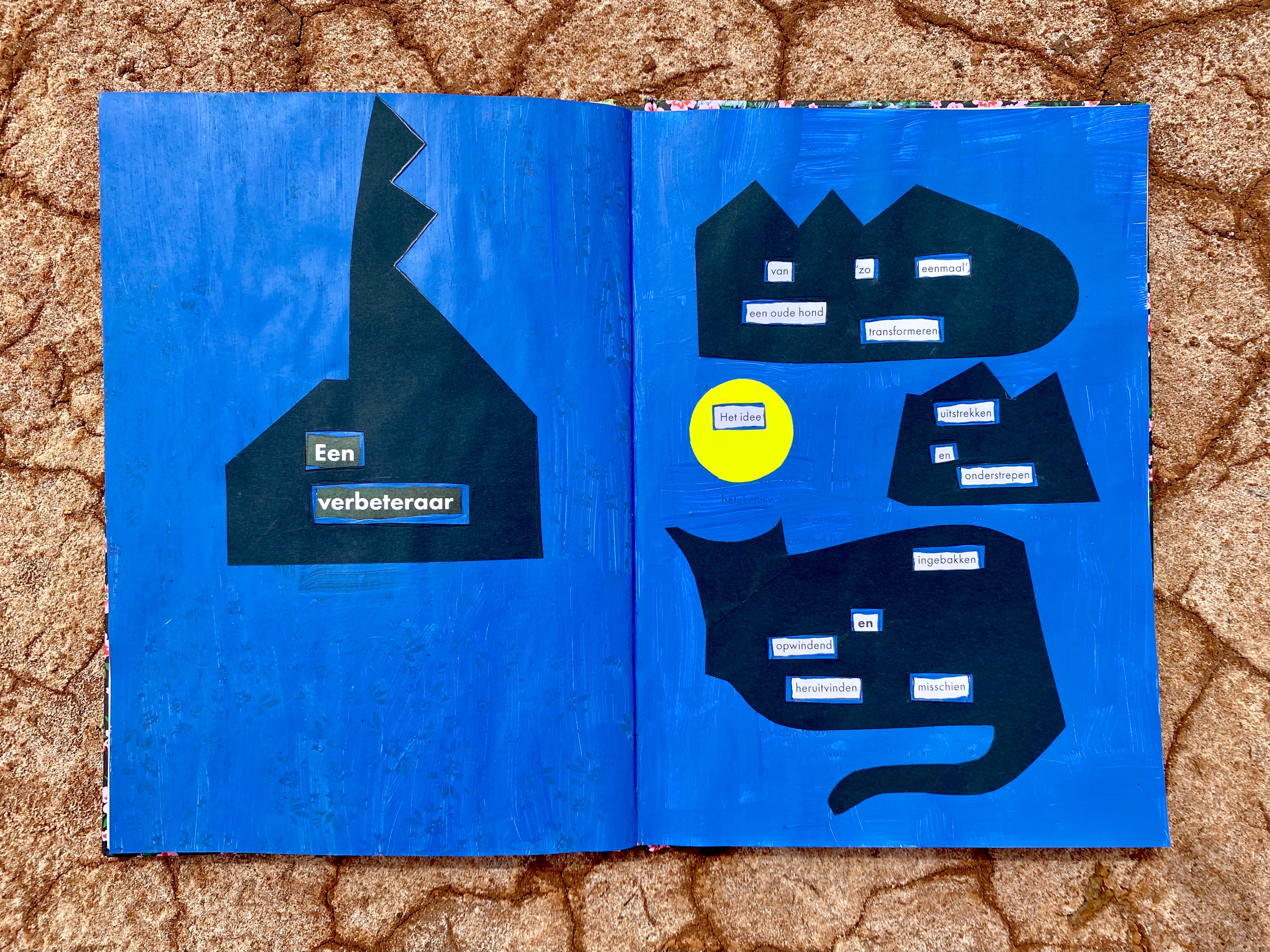 Een Verbeteraar Misschien | medium: found poetry art book & mixed media art | techniques: found poetry, painting & paper cut in paper book | dimensions: 22 x 32 cm | production date: 28 September 2025
