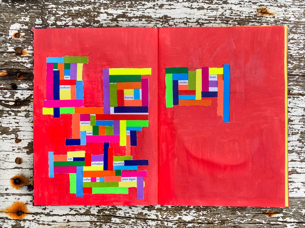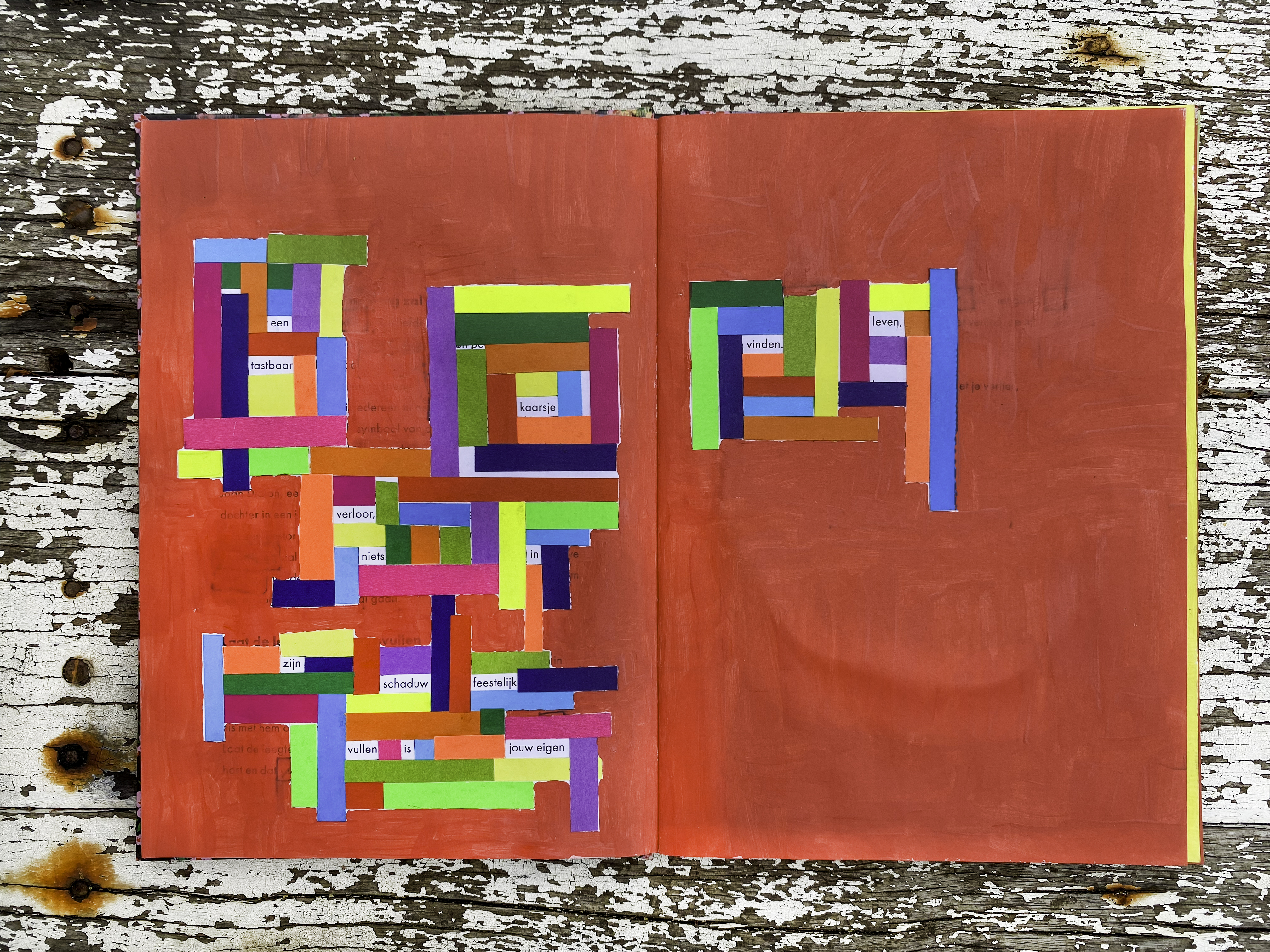 Een Tastbaar Kaarsje | medium: found poetry art book & mixed media art | techniques: found poetry, painting & paper cut in paper book | dimensions: 22 x 32 cm | production date: 7 October 2025