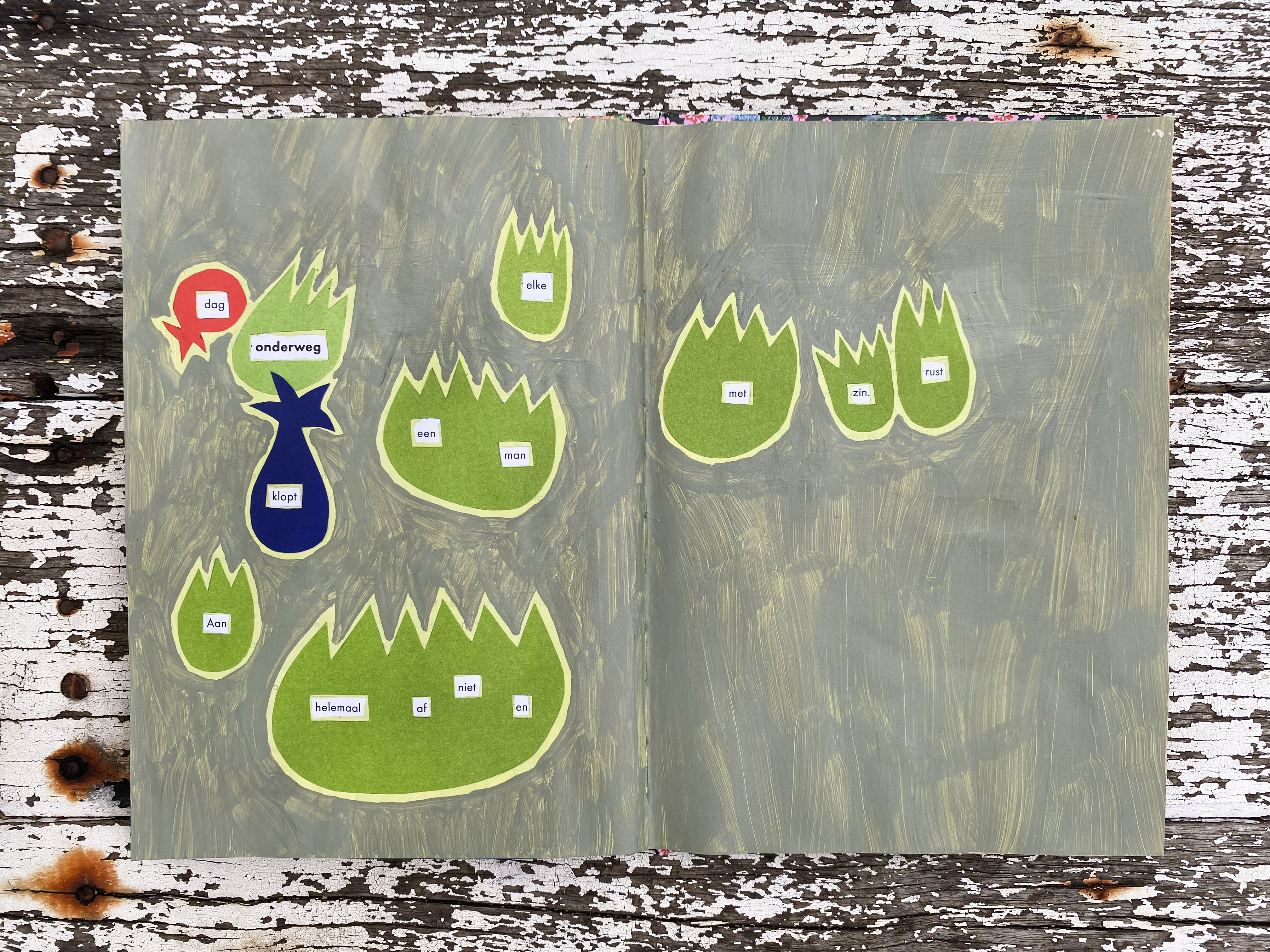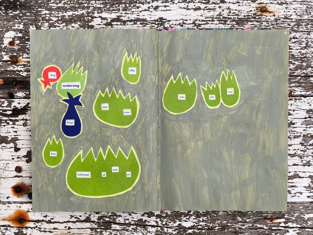 Onderweg | medium: found poetry art book & mixed media art | techniques: found poetry, painting & paper cut in paper book | dimensions: 22 x 32 cm | production date: 8 October 2025