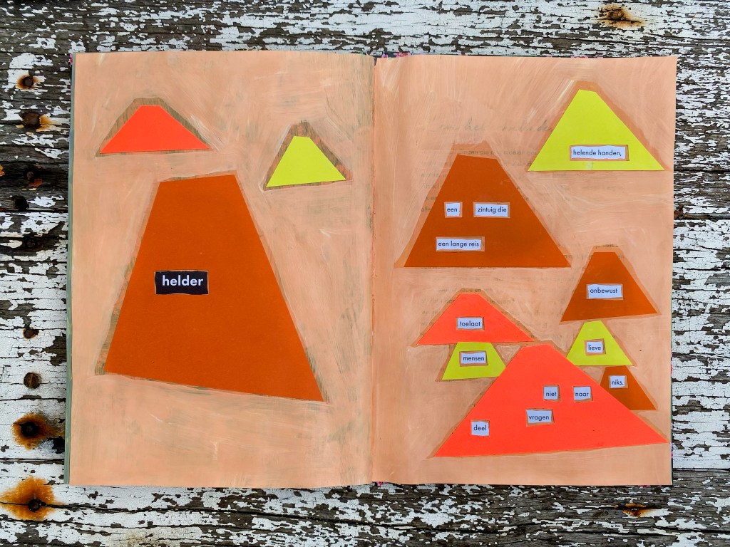 Helder Helende Handen | medium: found poetry art book & mixed media art | techniques: found poetry, painting & paper cut in paper book | dimensions: 22 x 32 cm | production date: 10 October 2025