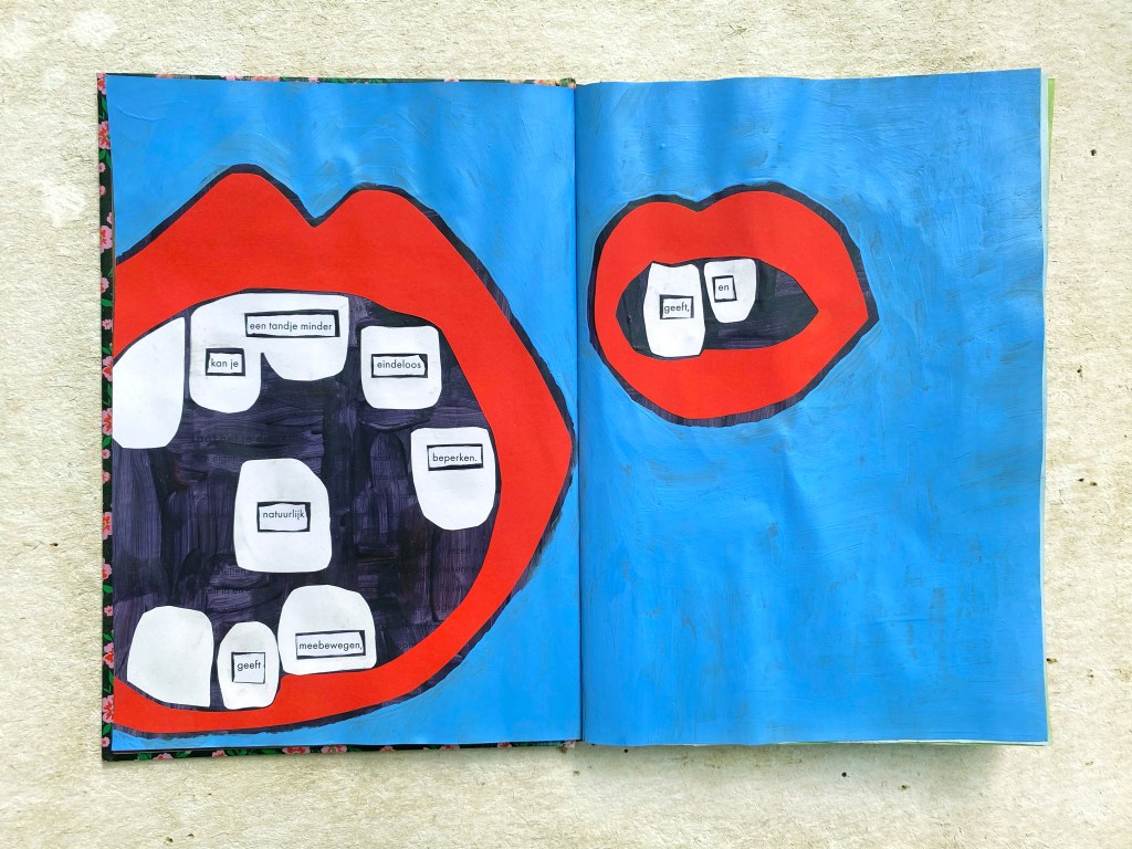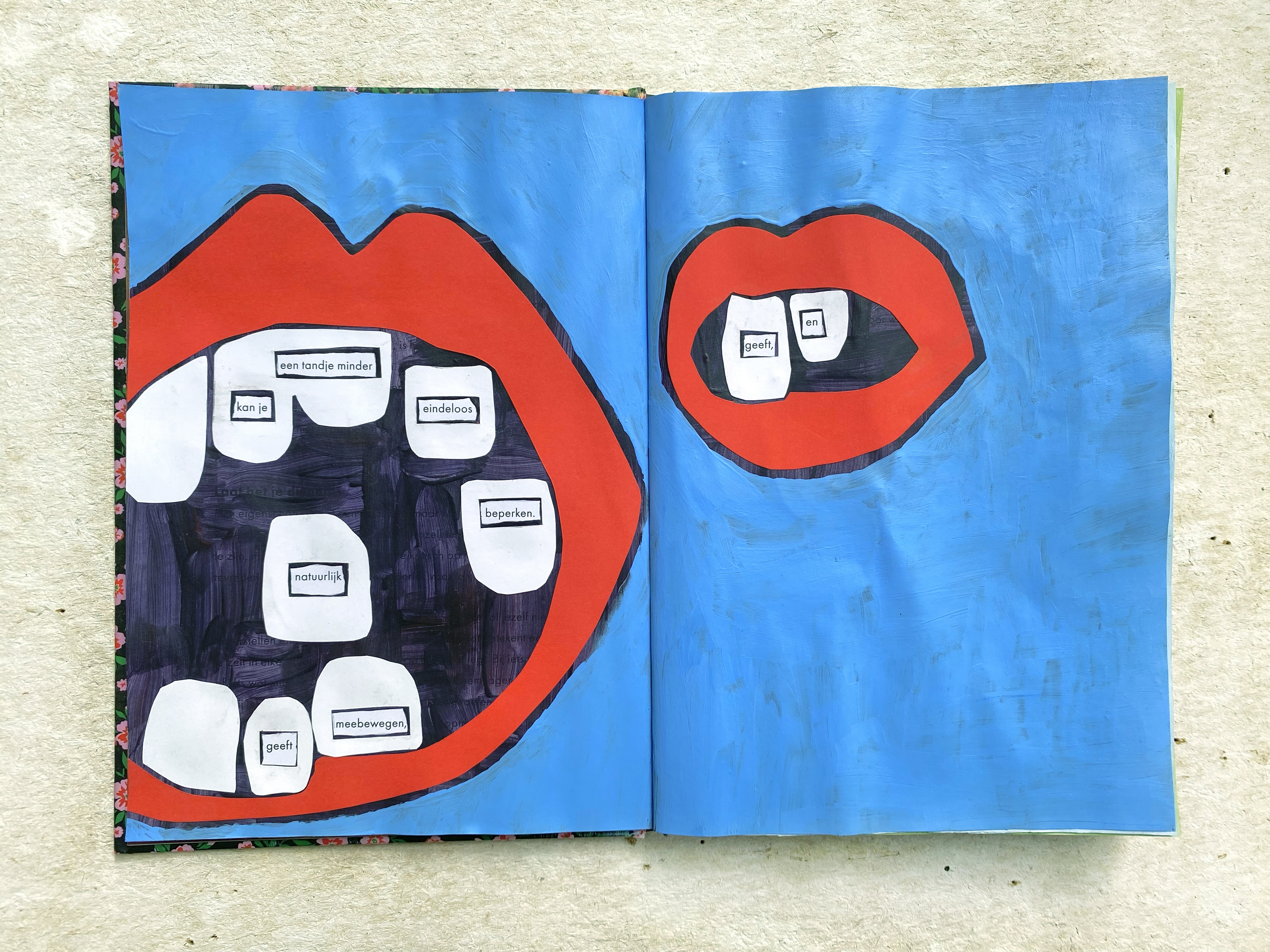 Een Tandje Minder | medium: found poetry art book & mixed media art | techniques: found poetry, painting & paper cut in paper book | dimensions: 22 x 32 cm | production date: 21 November 2025